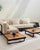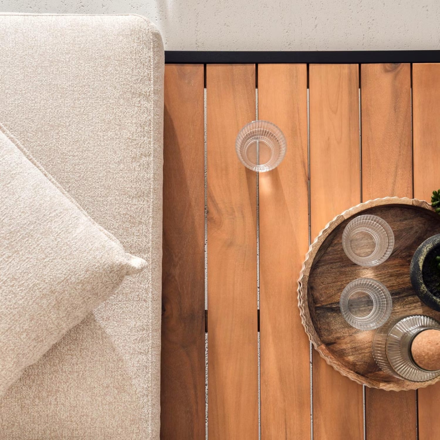 Two acacia wood side tables are built directly into the sofa’s structure, offering the perfect place to rest drinks, snacks, or decorative accents without needing extra furniture.
