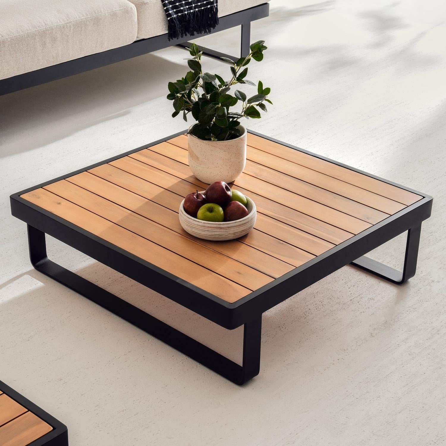 The matching square coffee table offers a wide surface and a beautifully grained acacia wood top, giving you a central space for serving or displaying.